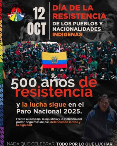 Quito, 12 oct (Prensa Latina) La Confederación de Nacionalidades Indígenas del Ecuador (Conaie) convocó para hoy, 12 de octubre, fecha de “resistencia, memoria y dignidad”, a una movilización en el contexto de las protestas contra las políticas económicas del Gobierno de Daniel Noboa.