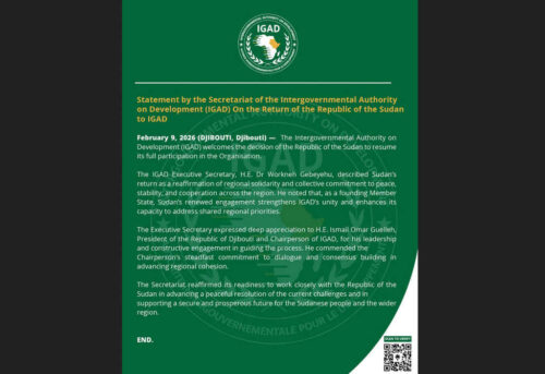 Djibouti, 9 feb (Prensa Latina) La Autoridad Intergubernamental para el Desarrollo (IGAD) acoge hoy con beneplácito la decisión de Sudán de reanudar su plena participación en la organización regional, informó un comunicado.