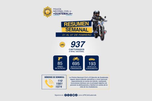 Ciudad de Guatemala, 8 feb (Prensa Latina) La Policía Nacional Civil (PNC) de Guatemala informó hoy la captura en la última semana de 937 presuntos delincuentes, cuando se cumplen 21 días de la declaratoria del Estado de sitio.