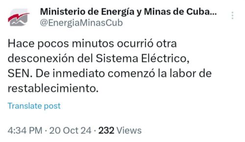 La Habana, 20 oct (Prensa Latina) El Ministerio de Energía y Minas de Cuba reportó hoy otra desconexión en el Sistema Eléctrico Nacional (SEN) y anunció que de inmediato comenzó la labor de restablecimiento.