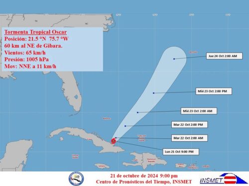 La Habana, 21 sep (Prensa Latina) La región central de la tormenta tropical Oscar abandonó el territorio de Cuba y está en los mares al norte de la provincia de Holguín, al oriente de la isla, informó hoy el Instituto de Meteorología (Insmet).