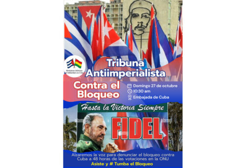 La Paz, 18 oct (Prensa Latina) El Movimiento Boliviano de Solidaridad con Cuba convocó hoy a una tribuna antimperialista frente el bloqueo económico, comercial y financiero de Estados contra la ínsula del Caribe, bajo la consigna de “hasta la victoria siempre”.